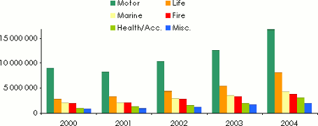 Written premiums split by class of business: 2000-2004
