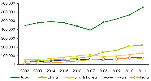Japan | 445 940 | 478 865 | 494 735 | 478 211 | 439 385 | 393 125 | 483 083 | 522 155 | 571 359 | 655 408 | 46.9% |