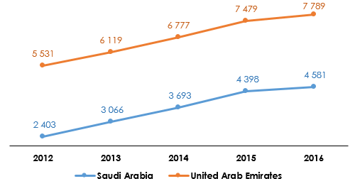 Saudi Arabia vs United Arab Emirates : evolution of non life insurance premiums (2011-2016)