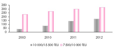 * Very Large Container Ships ** Ultra Large Container ShipsThe guiding force of container transport is the unit cost per TEU / mile. The economy of scale is crucial in maintaining profit margins, especially with the ever-decreasing freight rate per unit. The marginal gains are, however, likely to be reduced with further increase in vessels size.
