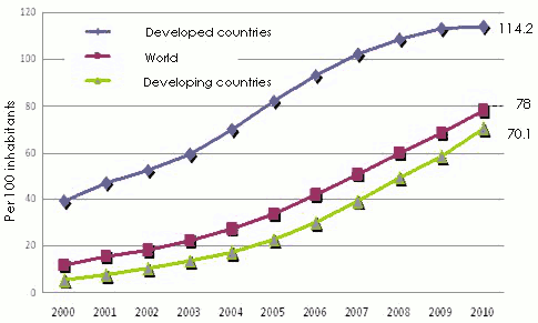 Subscriptions to mobile telephony per 100 inhabitants: 2000-2010