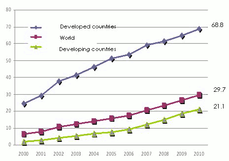 Since the last decade, the use of the internet has increased tenfold in developing countries, going from 2% of the population in 2000 to 21.1% in 2010. These figures remain, nonetheless, below those of the developed countries which posted in 2010 a number of users of 68.8% of the population versus 24.1% in 2000. These different rates do not reflect the reality, though. Developing countries now have more people connected to internet (1 195 000 000 users) than developed countries (849 000 000 users).