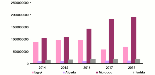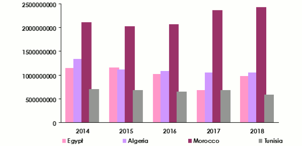 Morocco | 3 138 247 000 | 3 090 165 000 | 3 486 331 000 | 4 176 830 000 | 4 337 525 000 |
