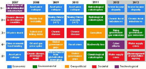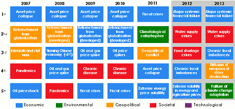Risk management enables companies to identify all threats to their business. The debate around this issue has pushed the "World Economic Forum" foundation to conduct a study on the development of the perception of global risks since 2007. The analysis is based on the assessment of hazards by specialists in various sectors of activity worldwide. The findings show that the perception of risks by the economic actors is often highlighted after the occurrence of an event or following a net increase in the threat. This shows that even if the company identifies risks related to its business it has little capacity to anticipate and prevent them. For instance, only as of 2011 has awareness about environment-related hazards appeared in the top five companies’ concerns, that is to say, after the occurrence of natural and nuclear catastrophes in Japan. Another example, economic issues will start to prevail in terms of impact as from 2008/2009 and the emergence of the first global financial crisis.