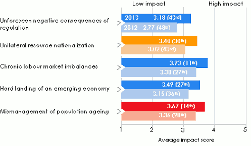 Source: World Economic Forum In 2013, the overall risk of most concern to companies for the next ten years pertains to income disparities. This is followed by chronic fiscal deficits and rising greenhouse gas emissions.