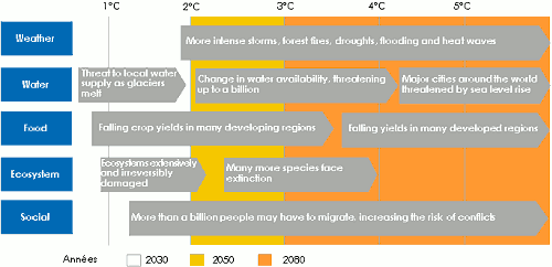 The risk of global warming has been studied according to five criteria. An increase in temperature of one degree or more could have catastrophic consequences in the long run. This evolution is shown in the table below.
