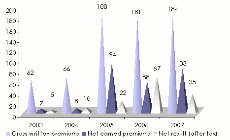 Despite the positive results reported in recent years, it was only at the start of 2005 that the company reached its cruising pace. For a capital worth 100 million USD, the 2007 turnover amounted to 184 million USD, net result to 35.9 million USD and return on equity to 19.85%. A performance at the reach of no other reinsurer in the region.