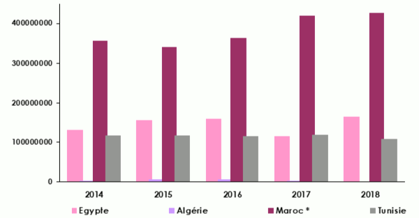 Maroc* | 355 994 000 | 341 309 000 | 362 816 000 | 420 453 000 | 427 435 000 |