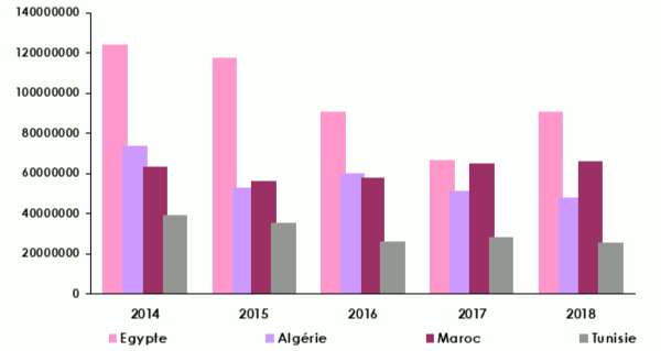 Egypte | 130 443 000 | 154 554 000 | 157 506 000 | 114 573 000 | 163 609 000 |