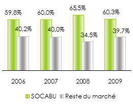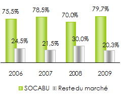 Avec une croissance moyenne annuelle de son chiffre d’affaires de +12,8% entre 2005 et 2009, la SOCABU est parvenue à conforter sa position de leader du marché burundais.