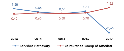 Berkshire Hathaway vs Reinsurance Group of America : évolution du chiffre d’affaires (2013-2017)
