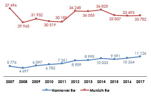 Hannover Re vs Munich Re : évolution du chiffre d’affaires (2007-2017)