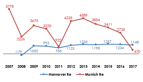 Hannover Re vs Munich Re : évolution du résultat net (2007-2017)