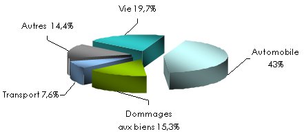 en USD| Automobile | Dommages aux biens | Transport | Autres | Total non vie | Vie | Total général | Parts (%) | Evolution 2007/08 | |